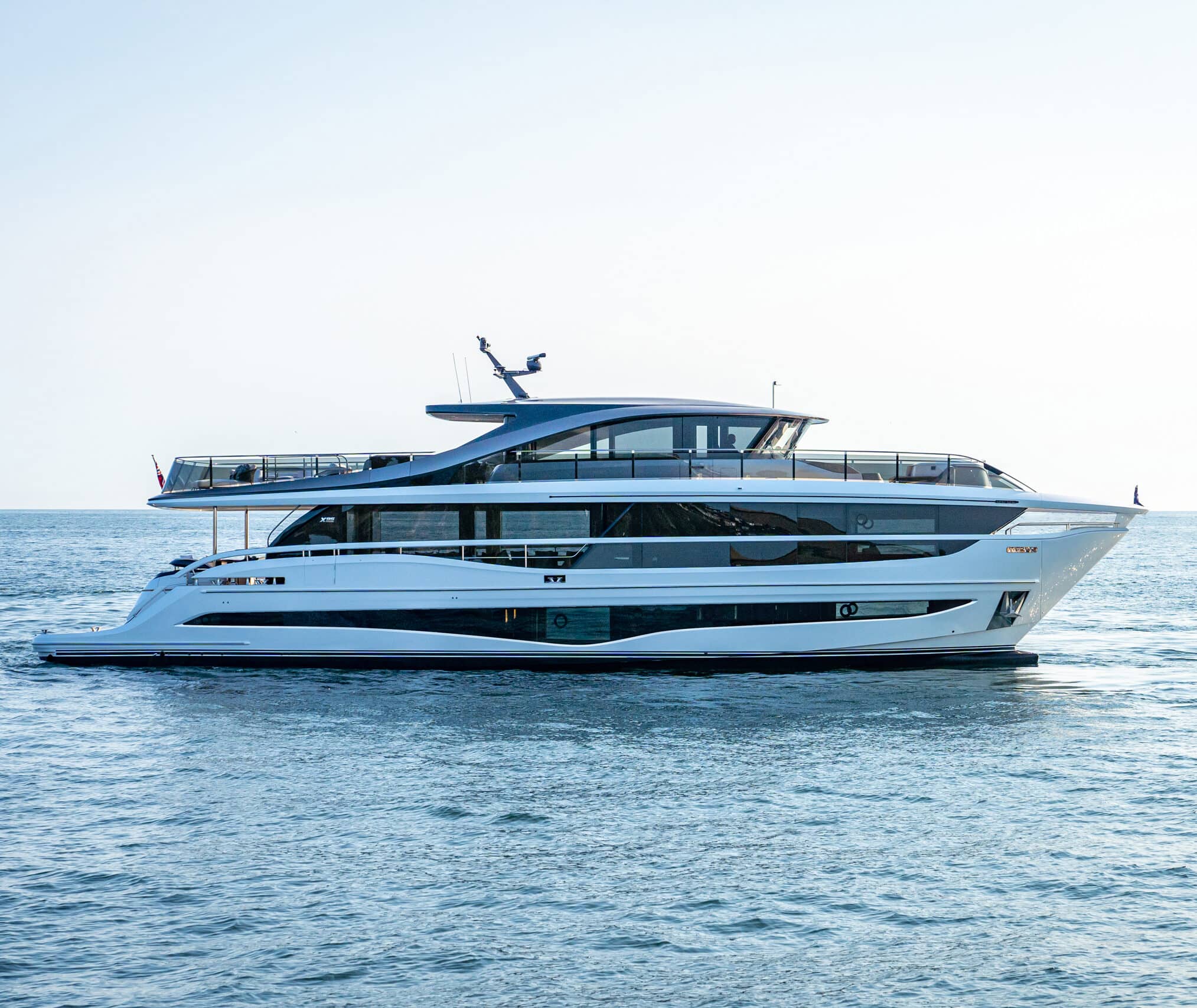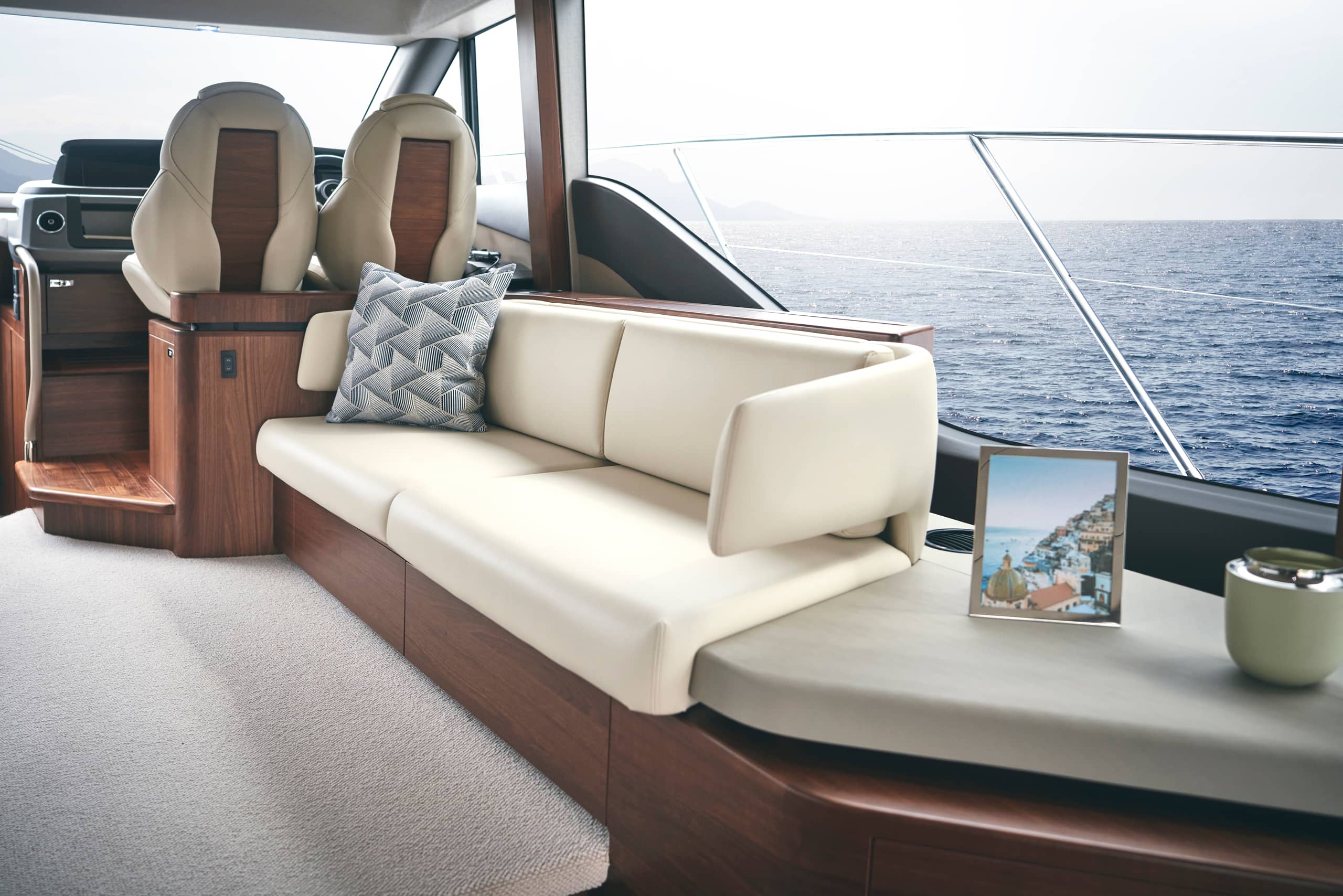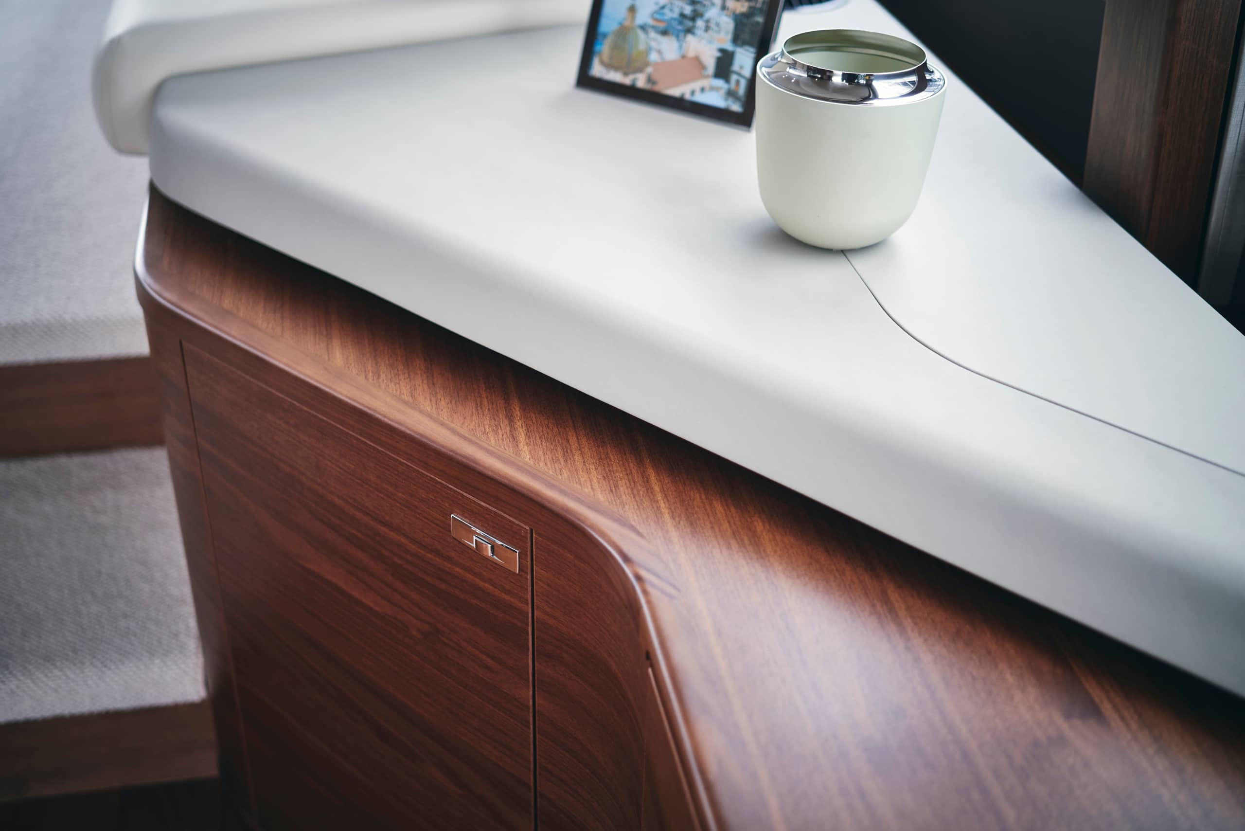 In dieser wunderschönen Motoryacht bildet 396.32 Walnut Crown Bronze den Kern des Innendesigns. Die großen, hellen Räume strahlen Komfort und Eleganz aus, mit sorgfältig ausgewählten Materialien, die nicht nur visuell beeindruckend sind, sondern auch den hohen Qualitätsstandards des Yachtbaus entsprechen. Das warme Holzfurnier bietet einen natürlichen Kontrast zu den hellen, weichen Stoffen und schafft eine harmonische Balance zwischen Frische und Wärme in einem Raum, der sowohl einladend als auch praktisch ist.