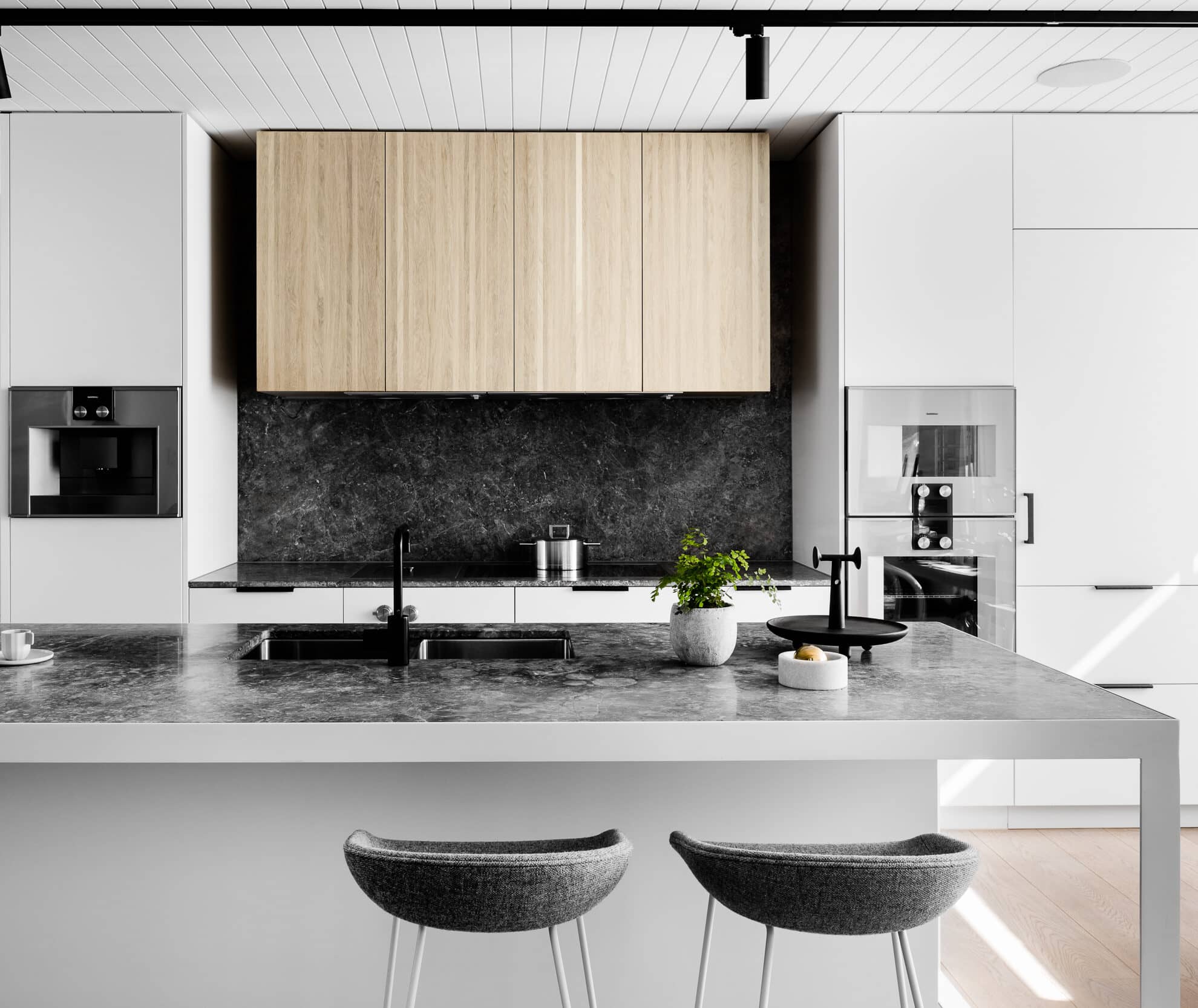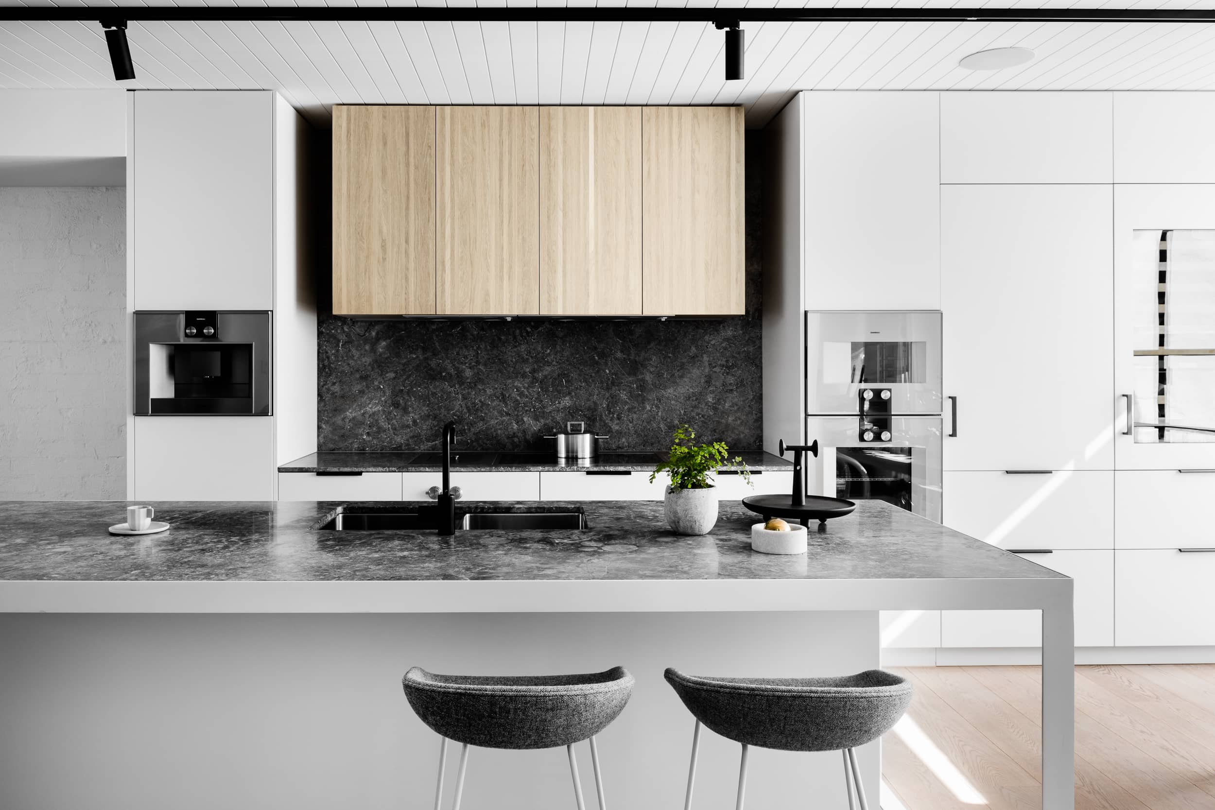 The interior of Bell Street House strikes a delicate balance between minimalist design and family functionality, with 178.02 V30 Oak Sandblasted veneer playing a central role in creating warmth and tactility. In the kitchen, the wood veneer cabinets contrast beautifully against sleek marble and clean, monochromatic surfaces, grounding the space with its natural texture. Throughout the home, the oak’s subtle finish enhances the calming aesthetic, seamlessly blending lightness with architectural elegance.