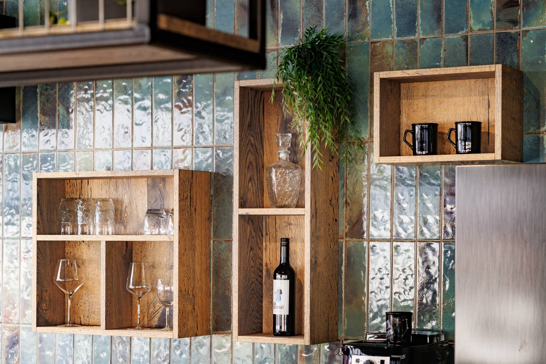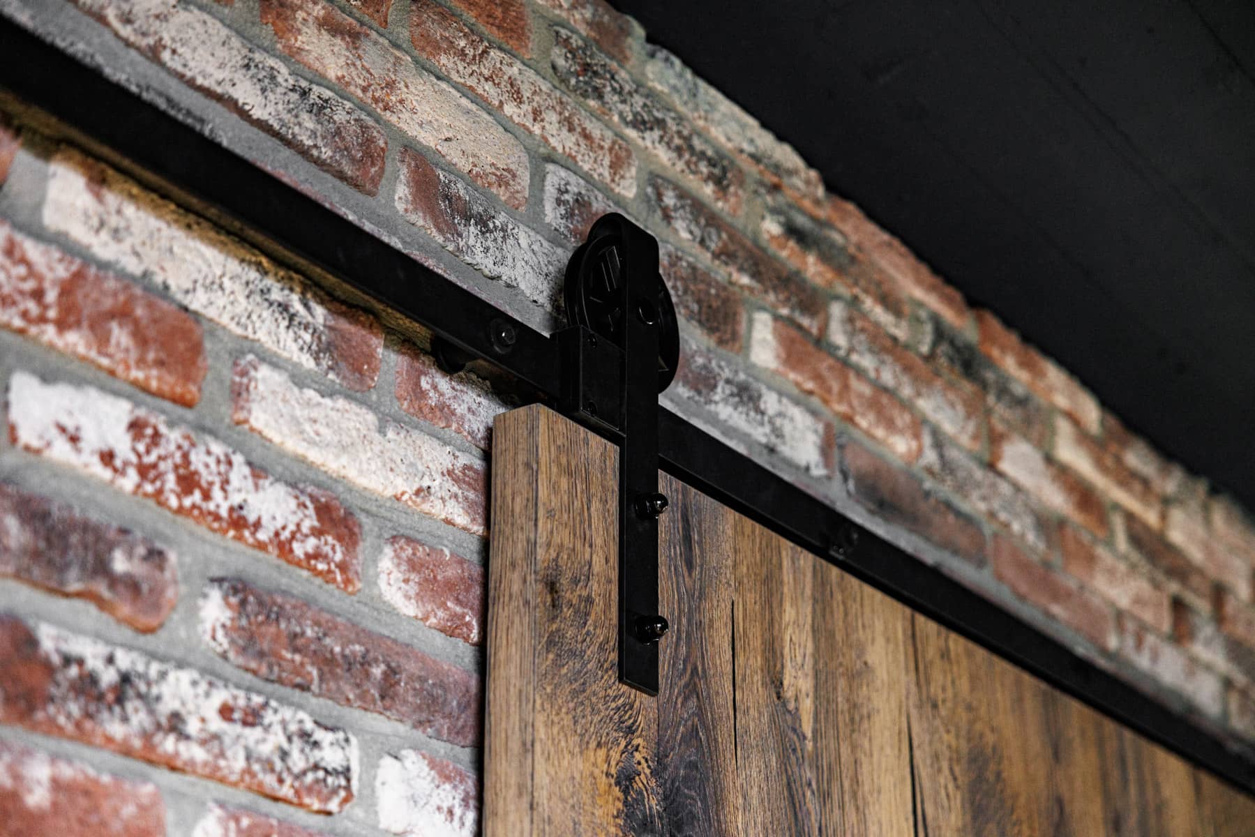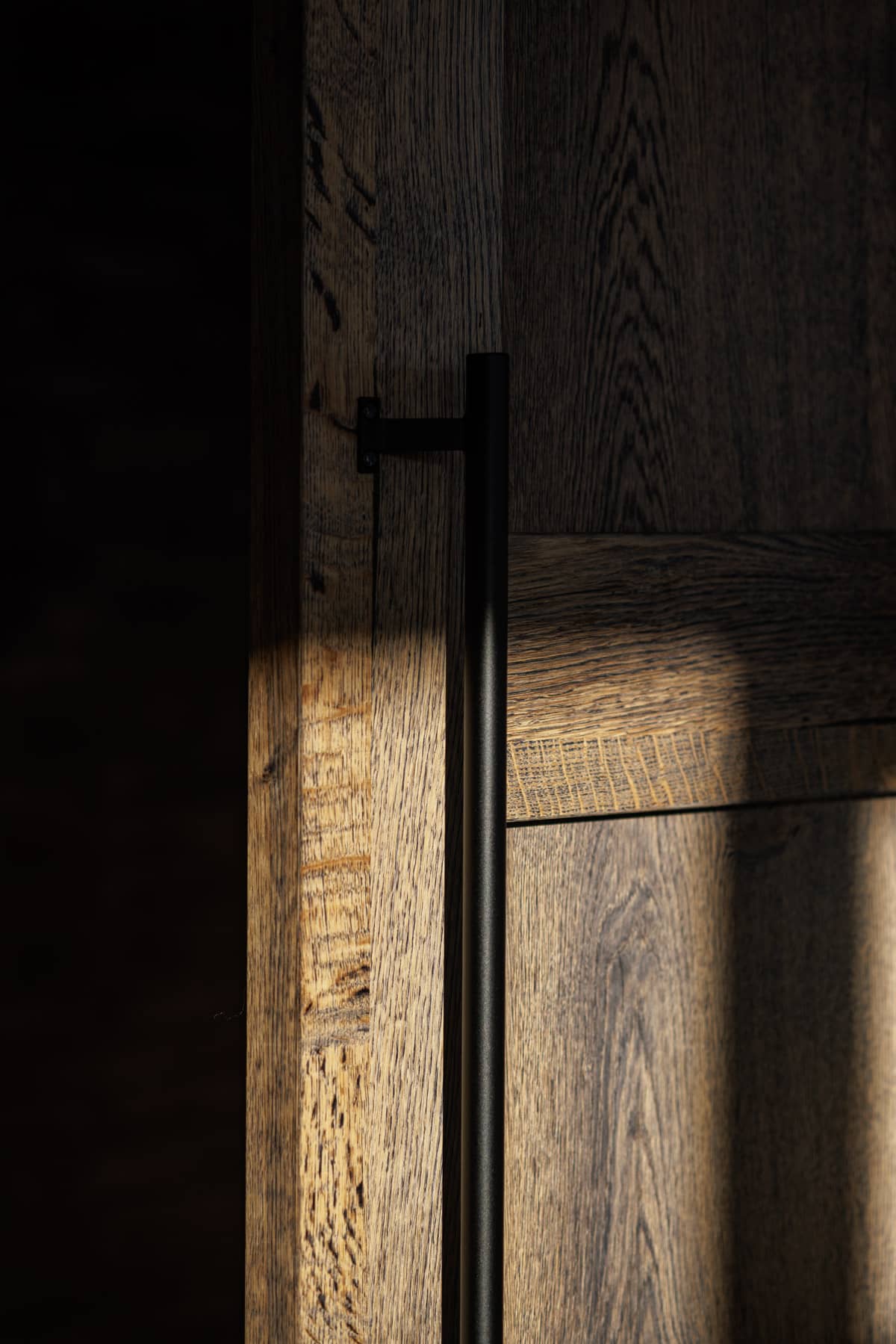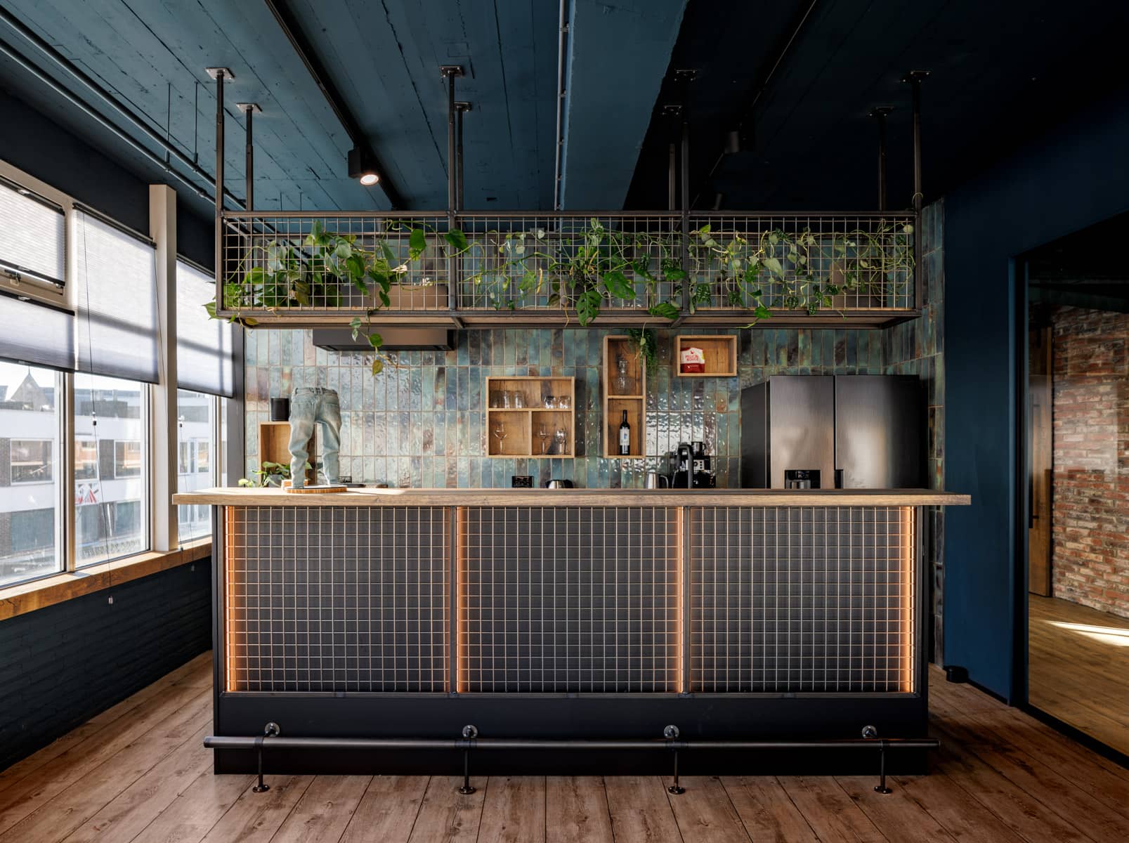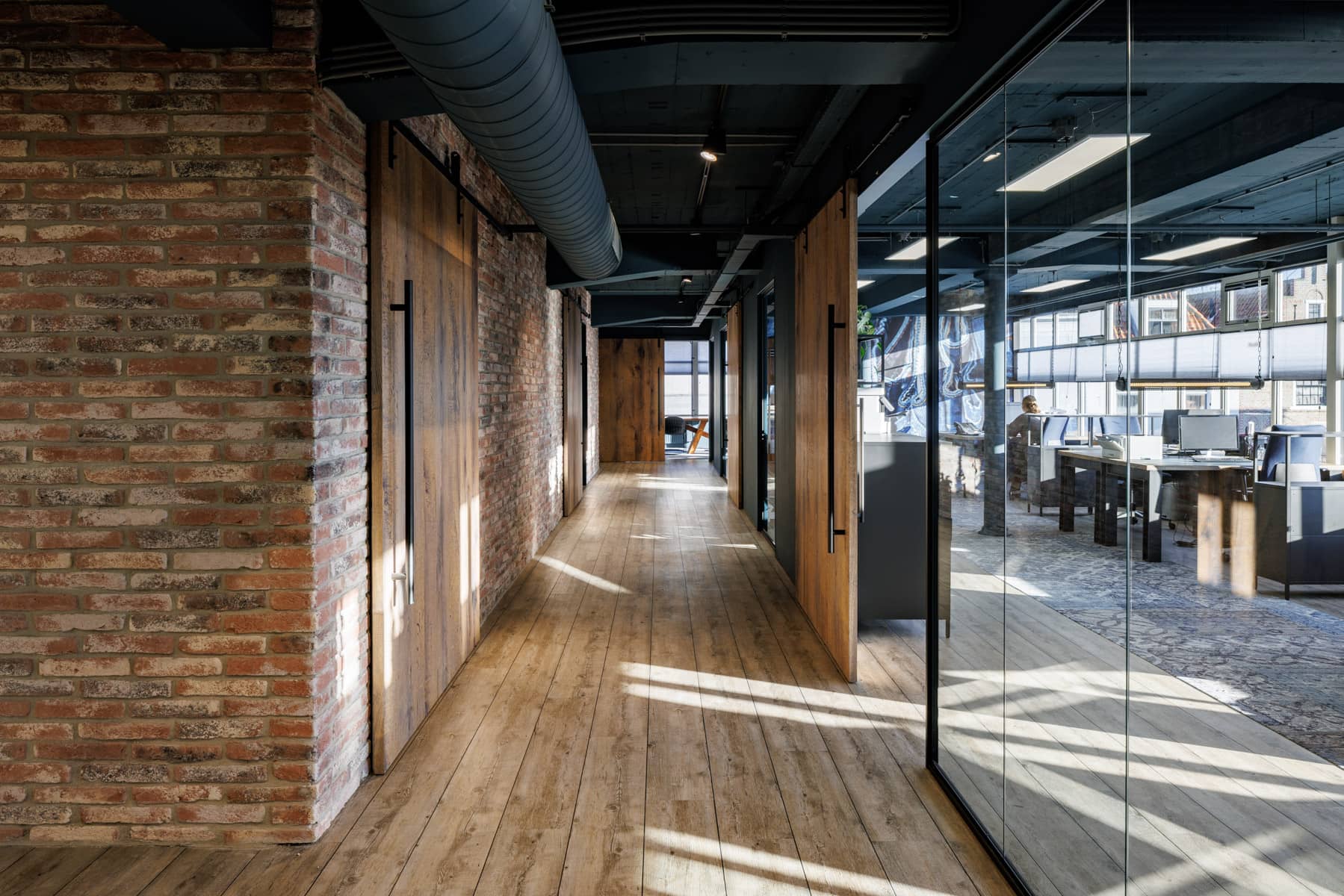 The office of Jeans Inn embraces a refined balance between industrial craftsmanship and authentic, natural materials. The raw brick walls are complemented by the use of heavy wooden sliding doors and wall panels, each adding strong texture and depth to the space. The 279.0,9.BV Beamwood Oak Jeans, with its irregular grain and warm tones, contrasts with the clean lines of glass walls and exposed metal pipes in the ceiling. This deliberate use of materials creates tension in the interior, where the simplicity and craftsmanship of the wood finish perfectly align with the timeless quality and durability of the jeans brand.