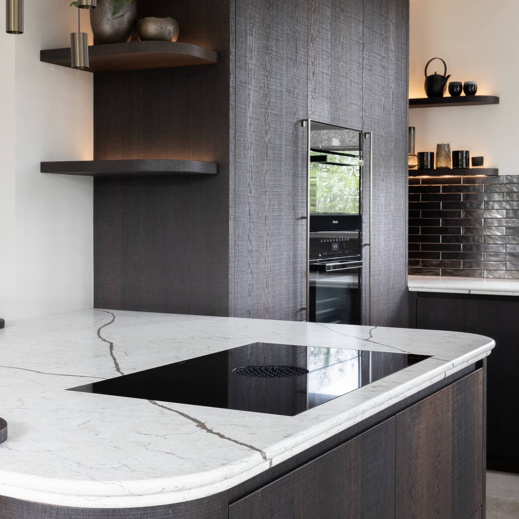 Voorgelakt houtfineerpaneel, Lignapal 166.02 Sawn Oak Smoked; Europees eikenfineer, A-kwaliteit (vrij van verkleuringen, mineraalstrepen, speldennoesten, fladervorming of fiddle-back tekening), gezaagde structuur, mix-match voegwijze conform 166.02 Sawn Oak Smoked (half-dosse/rift mix), gerookt (kleur volgens 166.02 Sawn Oak Smoked), afgewerkt met sluiergelakte watergedragen meerlaagse UV-uitgeharde polyacrylaatlak, minder dan 5 glansunits. Aan één zijde geperst, witte HPL op achterzijde, op 18 mm MDF, E1/CARB2-conform. Plaatformaat 3040 × 1210 mm.