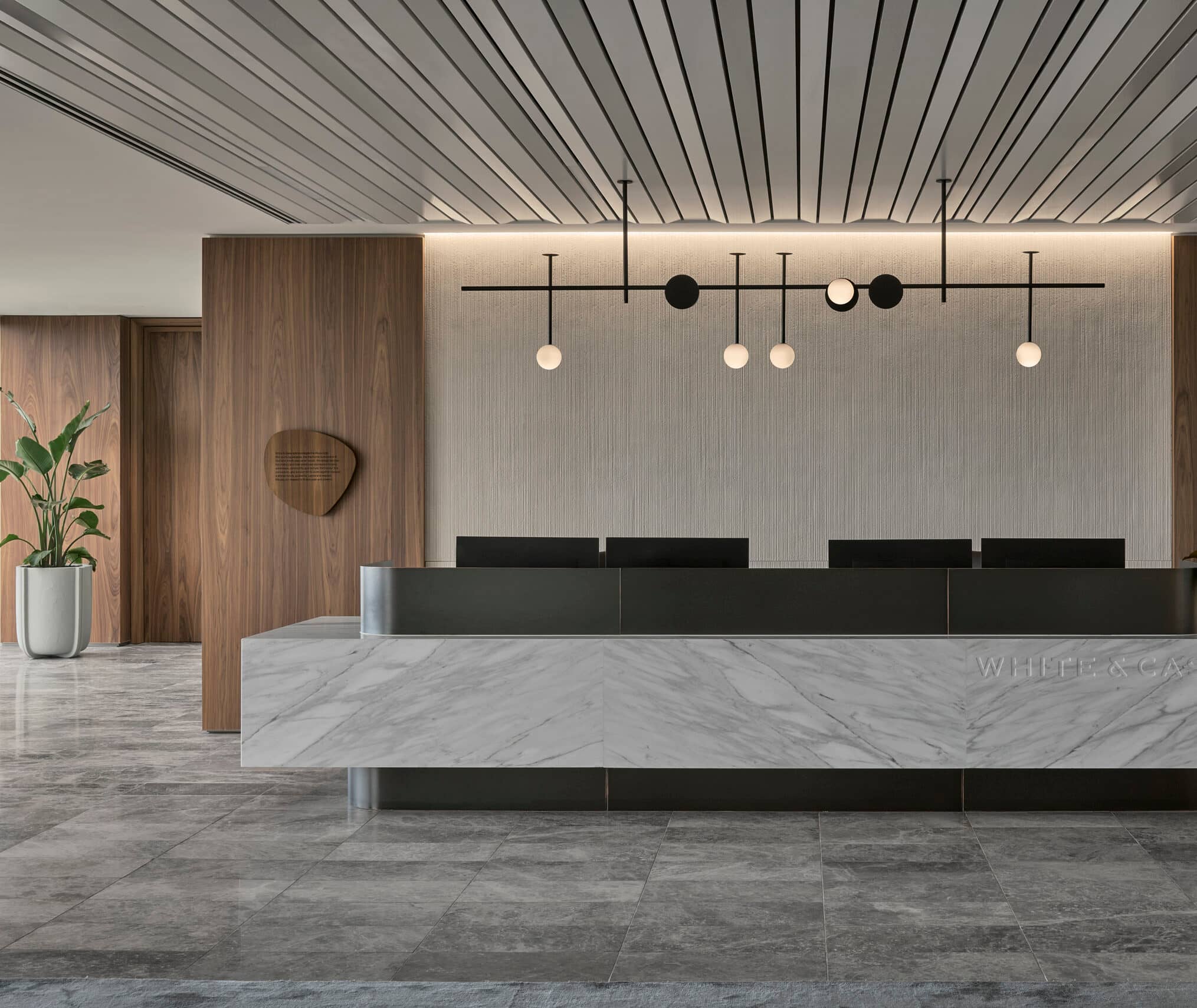 Het interieur van het White & Case kantoor in Melbourne weerspiegelt een ingetogen luxe waarin materialiteit en detail centraal staan. De toepassing van 396.32 Walnut Crown Bronze geeft de ruimte een rijke, gelaagde uitstraling. De warme bronsnuance versterkt de natuurlijke tekening van het notenhout en zorgt voor een subtiel spel van licht en schaduw binnen het interieur.